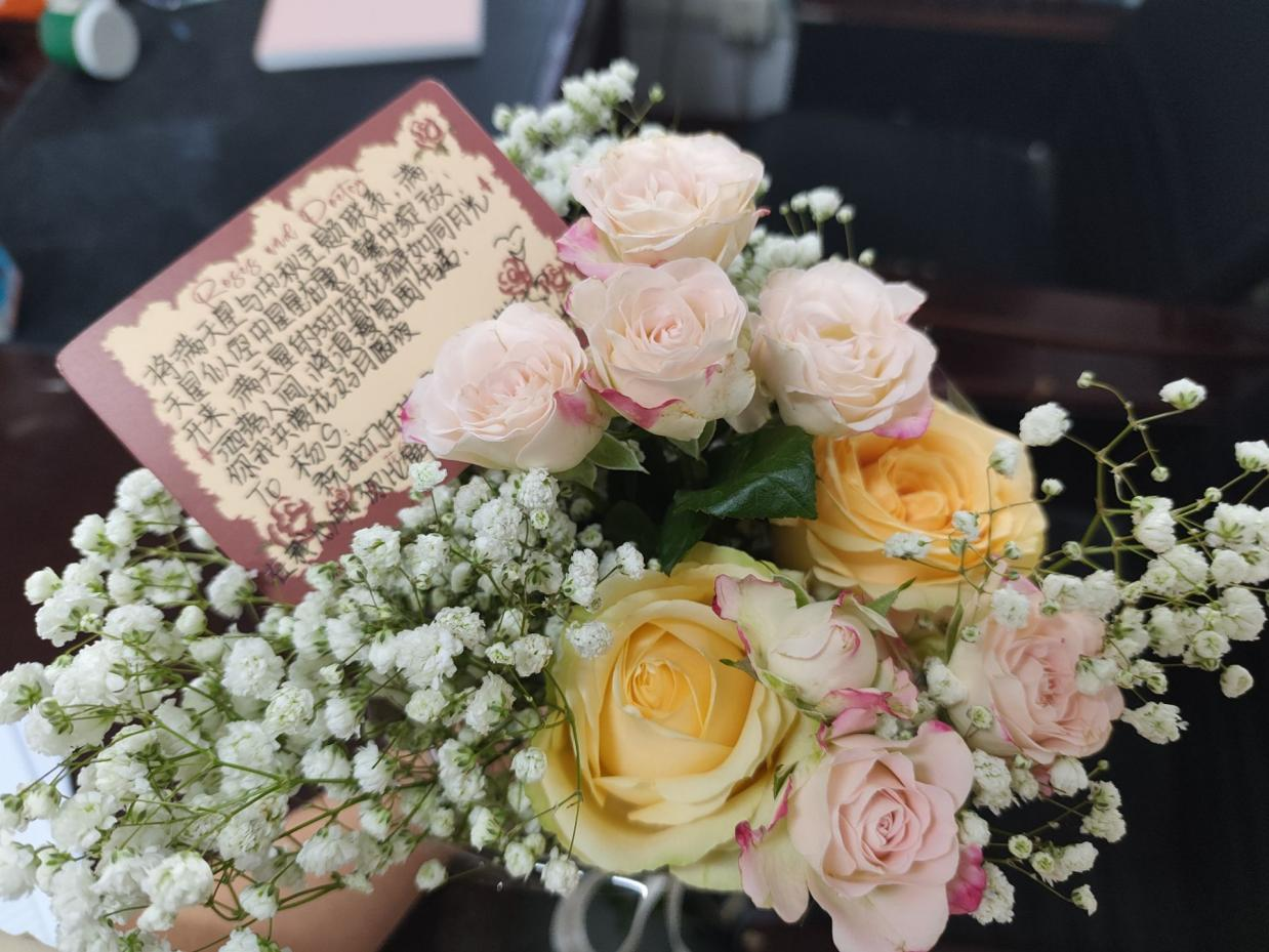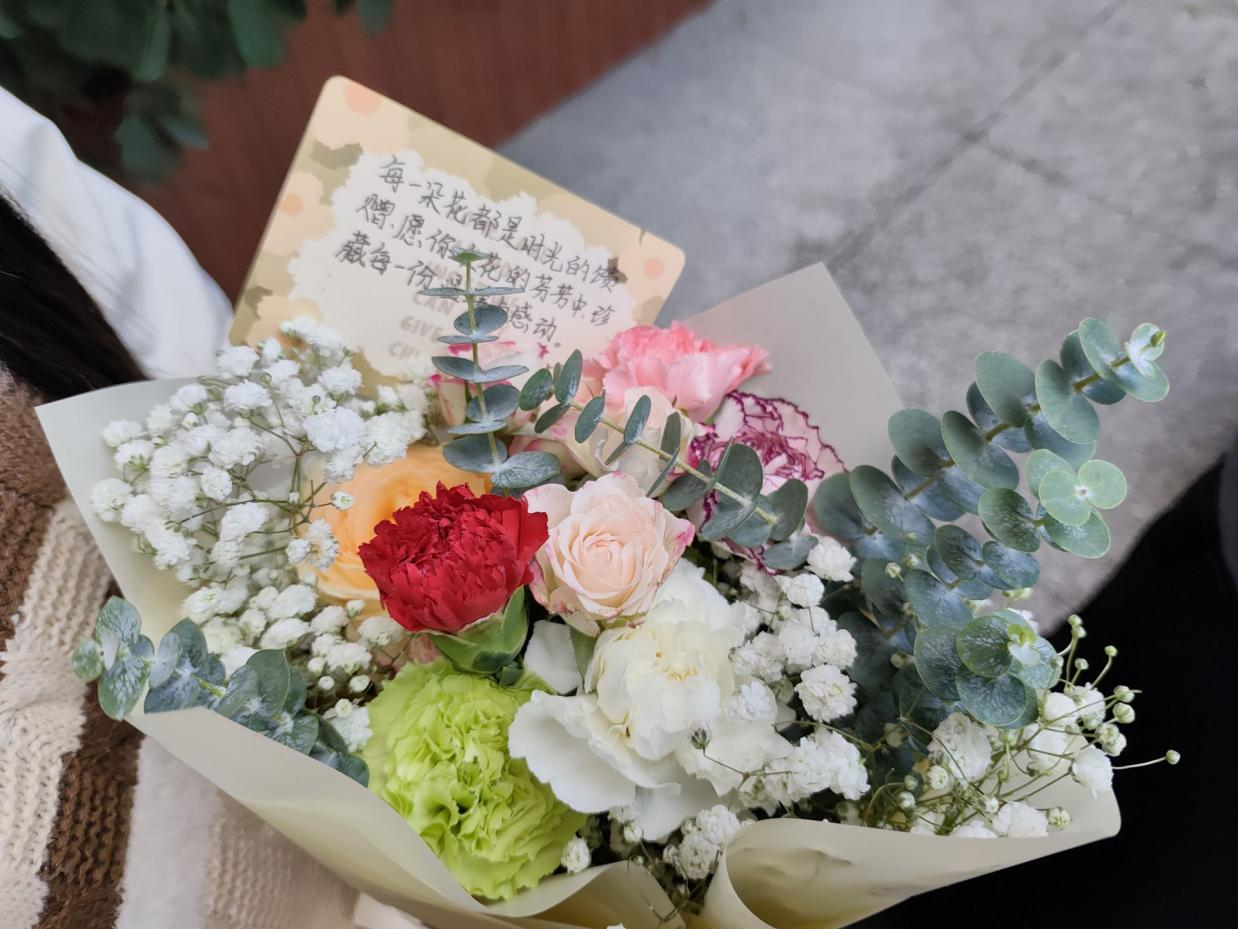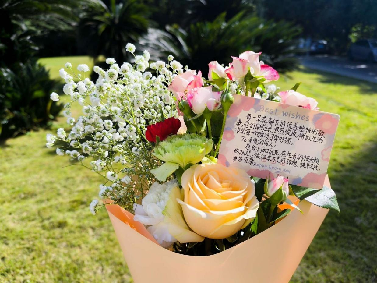 花束完成后,大家纷纷拿起卡片,将对家人的牵挂、对朋友的祝福落笔成文,简单的文字里满是真挚的情感。同学们捧着亲手制作的花束与写满心意的卡片合影留念,定格下这份专属秋日的温暖与浪漫。