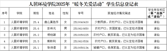 根据《关于开展2025年资助育人“暖冬关爱活动”的通知》(学生函〔2025〕59号)文件精神,按照文件评选条件,经个人申报、班级推选、学生工作办公室复核,报学院党政联席会议审议,确定以下5位同学获得“暖冬关爱计划”御寒衣服,现将评选结果向全院师生公示。